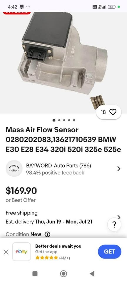 Bmw m20b20 rm350 and m20b25 rm650 mass airflow sensor in good working condition for sale